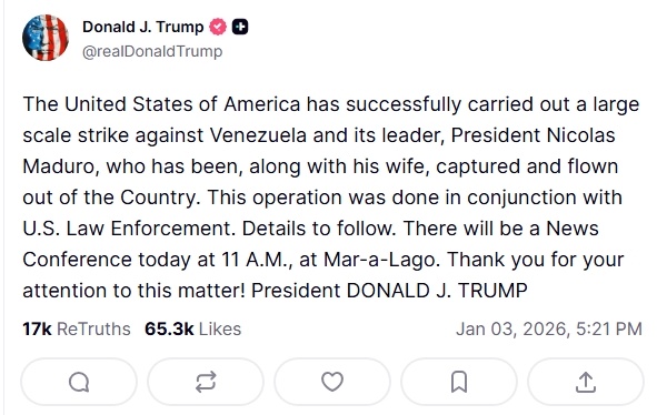 Then, U.S. president has announced in a Truth Social post that the U.S. has captured Venezuelan President Nicolás Maduro and his wife.